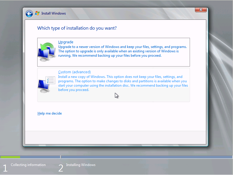 Temiz bir kurulum yapıcağımız için custom seçeneğini seçiyoruz.