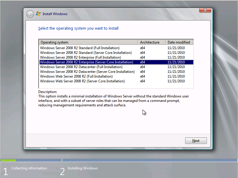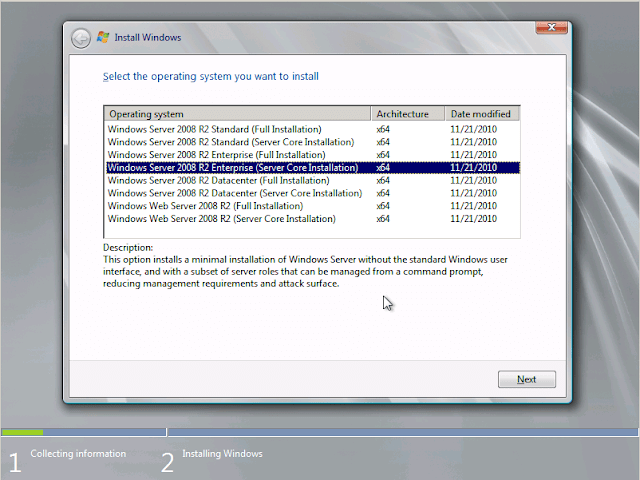 Burada görüldüğü gibi birden fazla core versiyonu karşımıza çıkıyor.Data center,web server,standart gibi seçenekleri var biz enterprise core serveri seçiyoruz ve next diyoruz.
