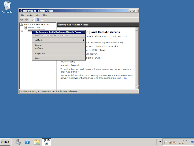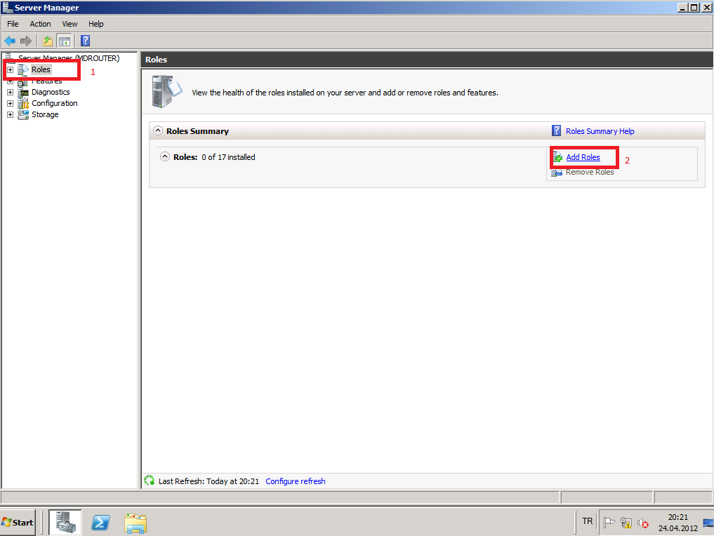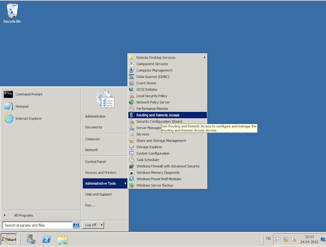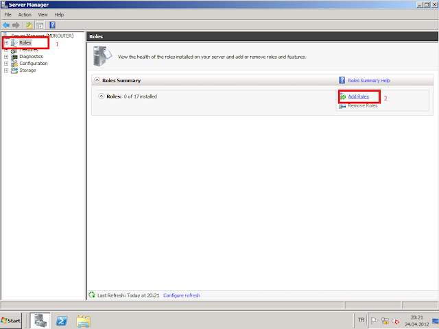 Diğer 2 network adaptörünüde aynı şekilde yapılandırdıktan sonra. Router görevi yapması için 2008 R2 bilgisayarımıza gerekli rolu yüklemeye geldi sıra.