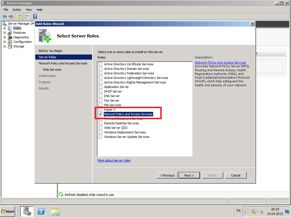 Network Policy and Access services’e tıklıyoruz.