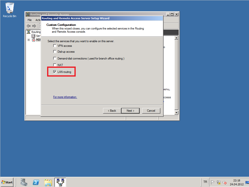 Biz sadece routing işlemi yapıcağımız için Routing and remote access services seçeneğini tıklayıp next diyoruz.