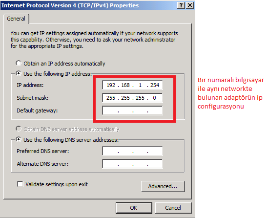 1 numarali bilgisayarımızın default gateway’i olarak verdiğimiz ip’yi gördüğünüz gibi routing işlemi yapıcak olan server 2008 r2 bilgisayarımızda lan-1 network adaptöründe ip olarak verdik.