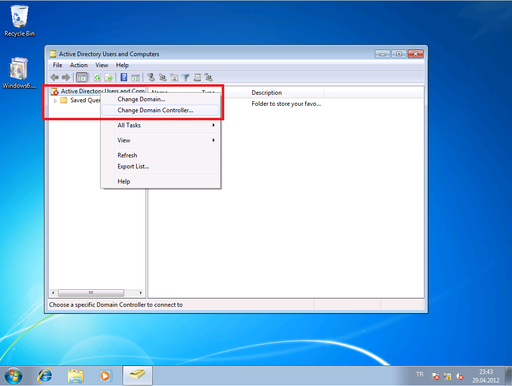 AD Users and Computers’i tıkladıktan sonra karsımıza gelen ekranda görüldüğü gibi sağ tıklayıp change domain controller diyoruz.