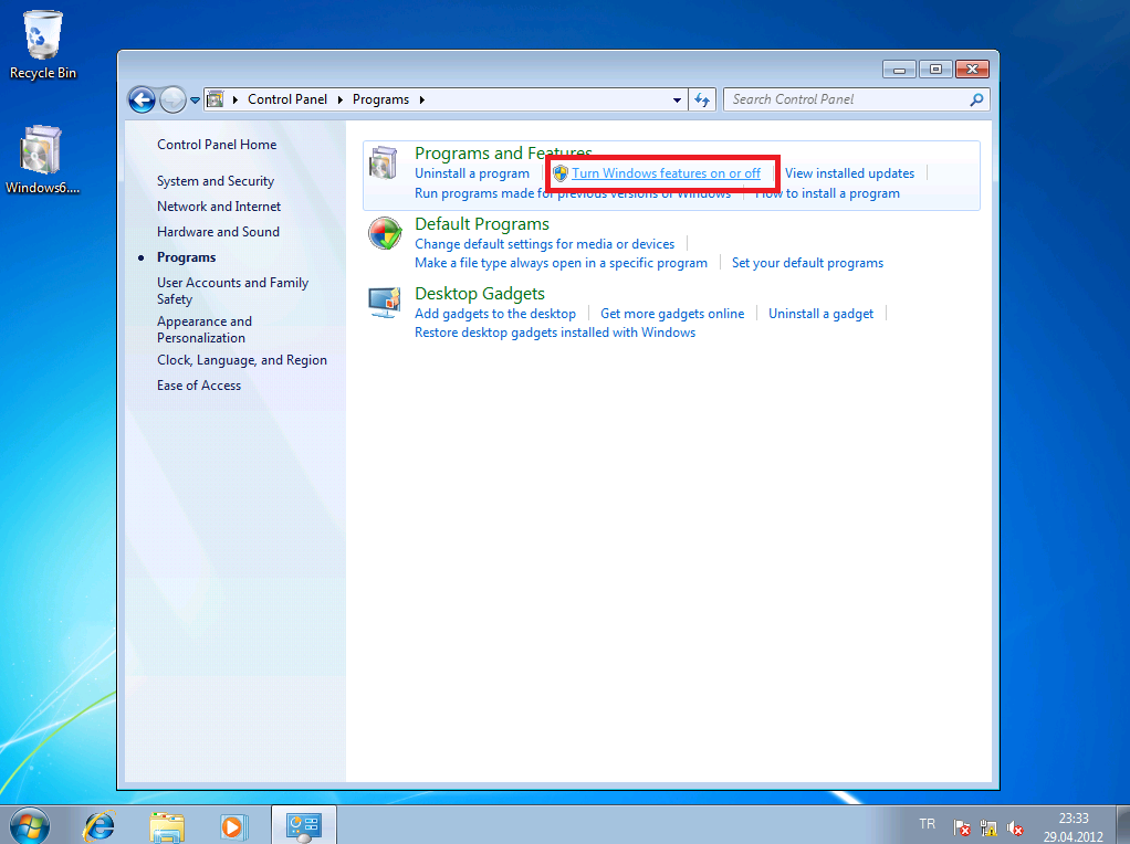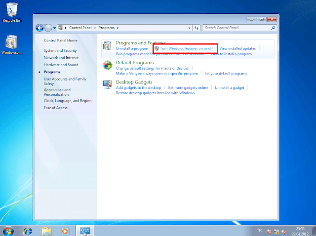 Roll ve features eklemek için tıklayacağımız yer “Turn Windows Featres on or off”.