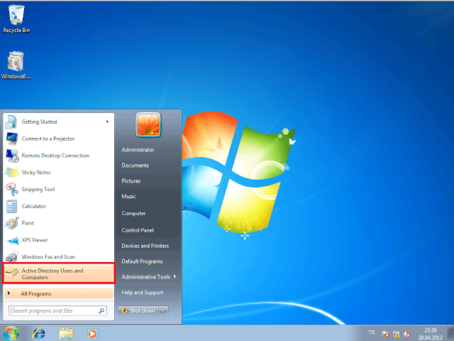 Görüldüğü gibi AD Users And Computer Start menümüze geldi.Şimdi AD’nin kurulu olduğu Pc’ye bağlanıp AD’yi nasıl yöneteceğimizi görelim.