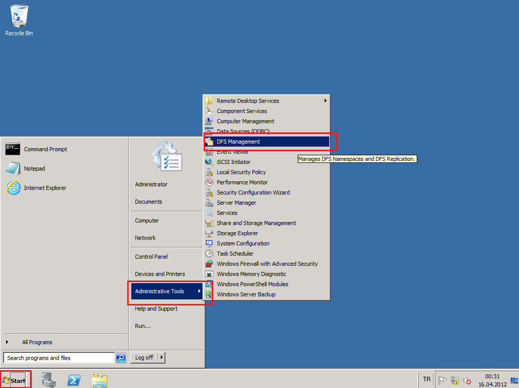 Şimdi domain kontroller olan bilgisayarımızın C’sinde Satis diye bir klasör oluşturuyoruz ve bu klasörü paylaşıma açıyoruz.Sonra DFS rolünün yüklü olduğu serverimize geliyor ve DFS e şu adımlarla ulaşıyoruz.