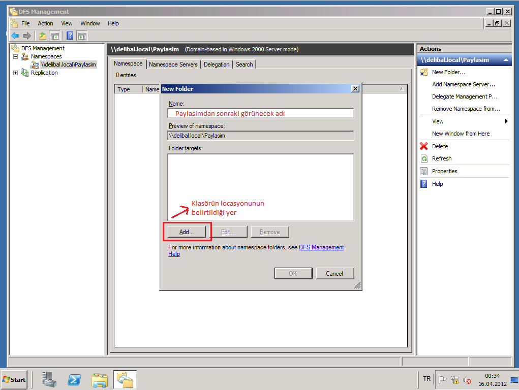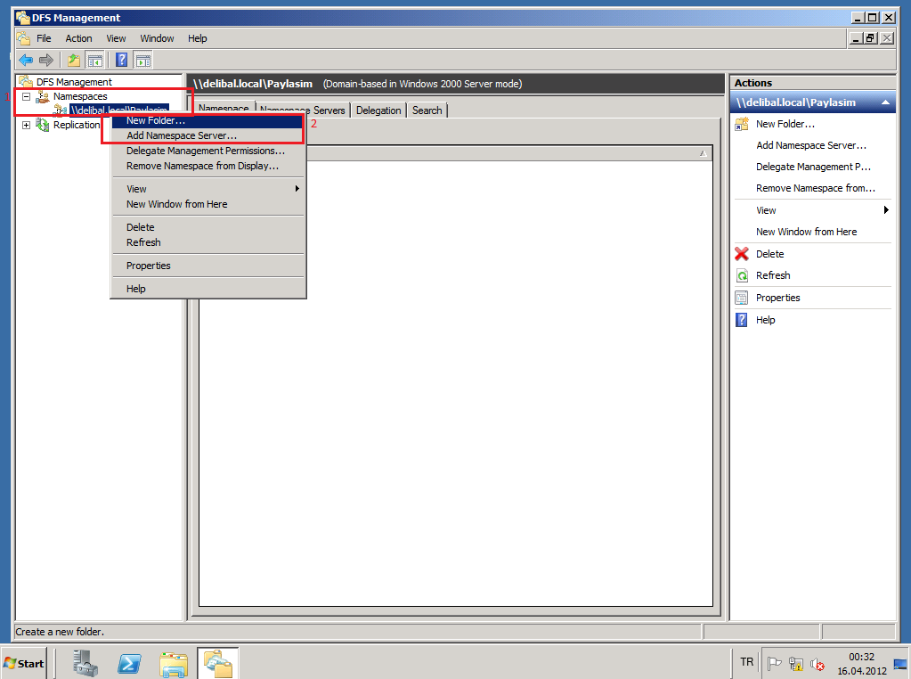 Name Spaces’nin altında bulunan bende “ \\delibal.local\paylasim” olan namespaceme sağ tıklayıp new folder diyorum.