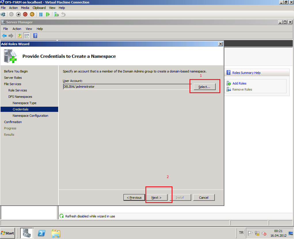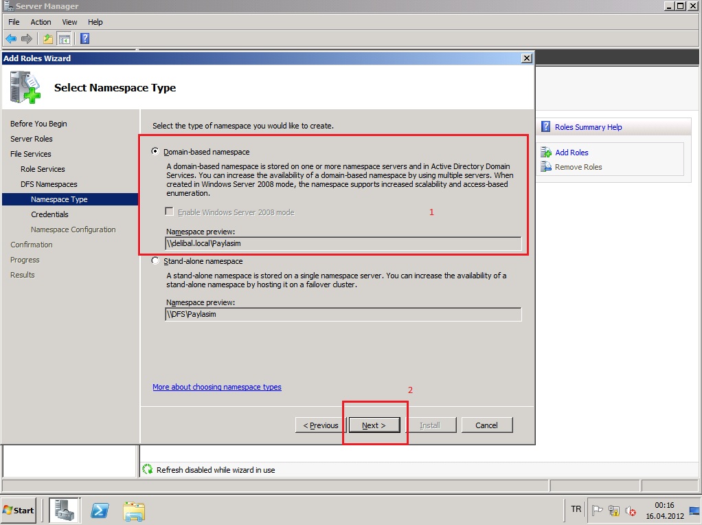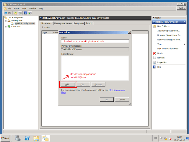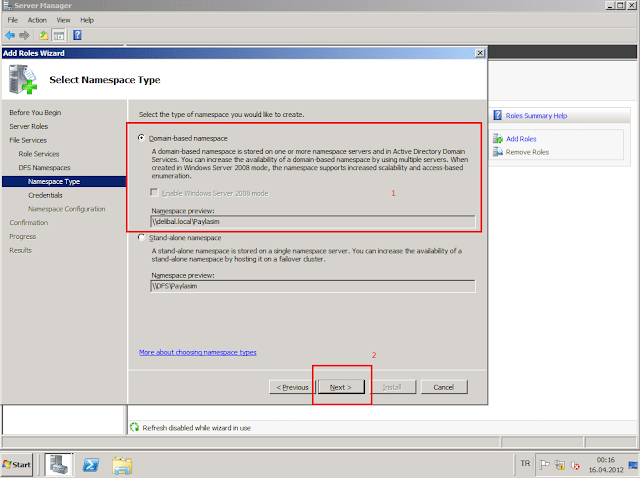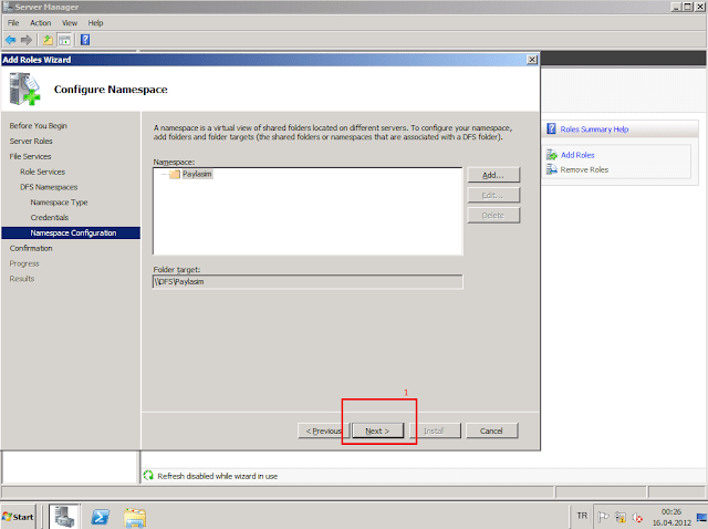 Karşımıza gelen ekranda ki NameSpace olgusundan biraz bahsedelim.DFS’in amacını hatırlarsanız ağınızda dağanık olarak bulunan paylasımların ortak bir alana toplanması diyebiliriz.Peki bu ortak alan nedir? Bu ortak alanı isimlendirdiğimiz ve yönettiğimiz yer Namespace’dir.