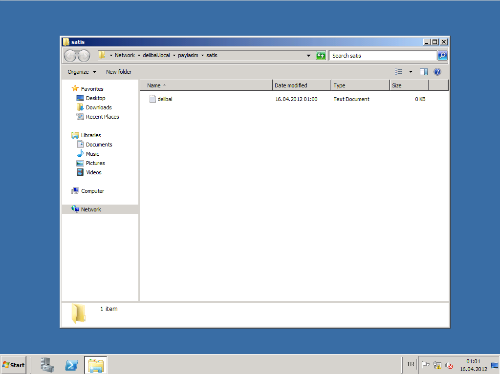 Şimdi dc mizdeki satis klasörüne şu şekilde ulaşmaya çalışalım.öncelikle içi boş olucağı için dc deki satis klasörünün içerisine herhangi bir dosya koyabilirsiniz.Amaç paylaşıma sağlıklı bir şekilde ulaşıp ulaşmadığınızı anlamak.