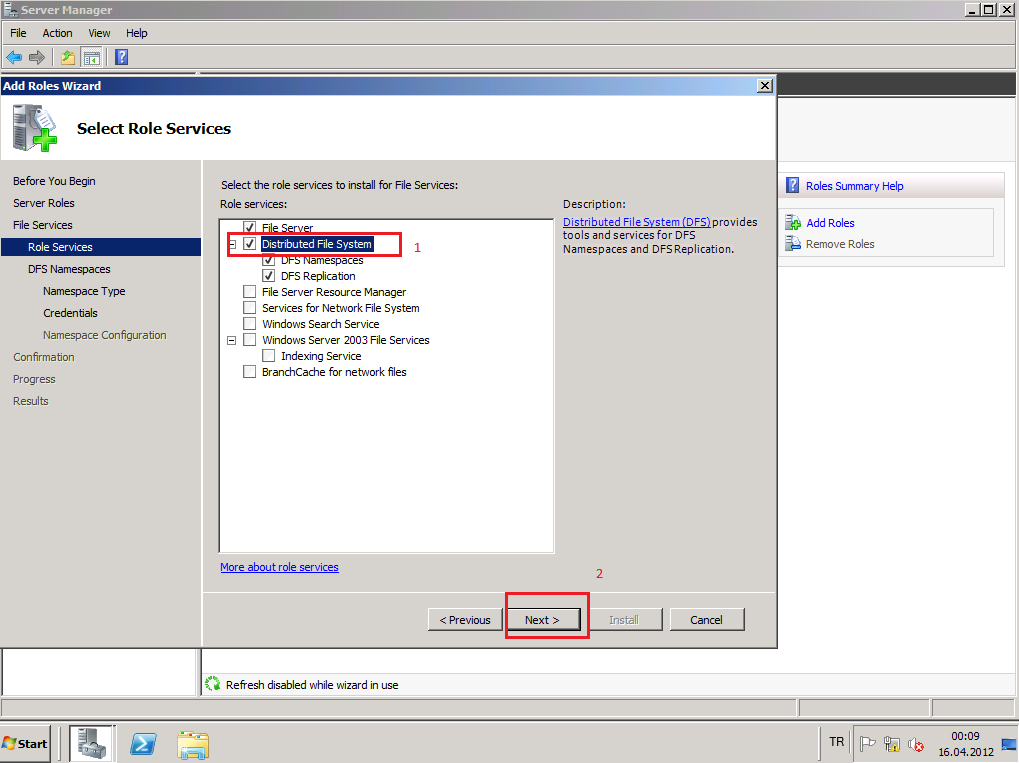 Next dedikten sonra File Services ile ilgili bir bilgilendirme ekranı geliyor.Next diyerek geçiyoruz ve karşımıza gelen ekranda şu işlemleri yapıyoruz