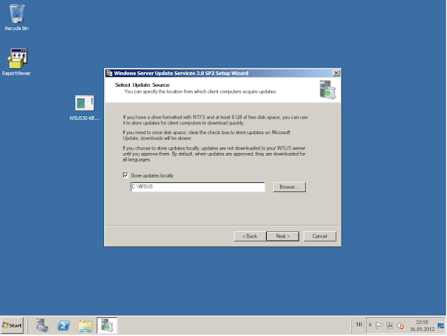 Windows update serverlardan alıcağı ve clientlara dağıtacağı updatelerin bu bilgisayar üzerinde nereye download edileceğini belirtiyoruz.