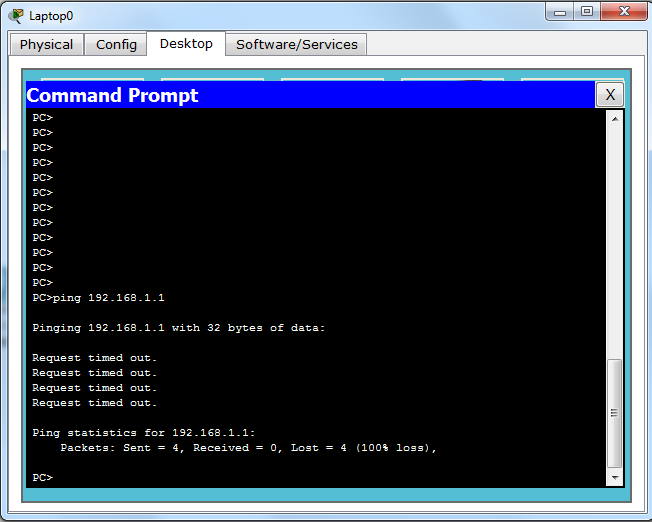 Fastethernet 0/1 de bağlı olan 192.168.1.1 ip’li bilgisayara ping atamıyoruz.Peki şimdi eski bilgisayarımızı FastEthernet 0/2 ‘ye bağlıyalım ve bakalım 192.168.1.1 ‘e ulaşabilicek mi ?