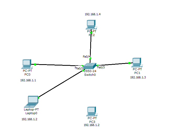 Görüldüğü gibi fasthethernet 0/2 portundaki şirket bilgisayarını laptopa bağladım.Yapımda DHCP bulunmadığı için ip adresini 192.168.1.2 şeklinde kendim girdim.