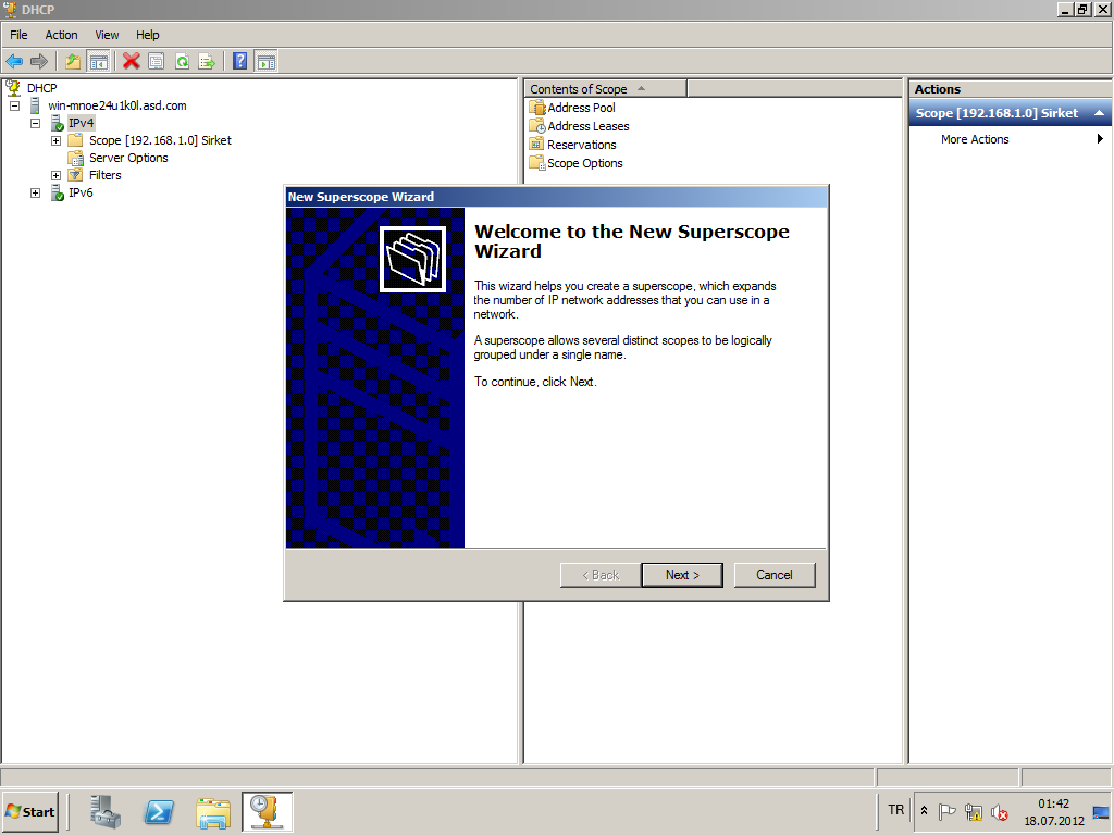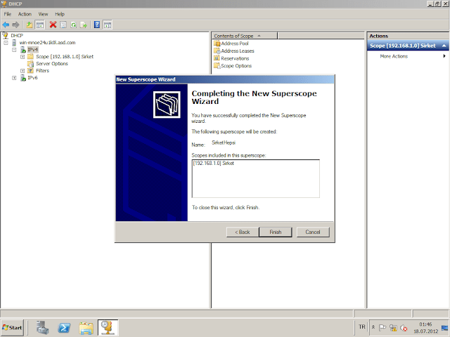 Yani 192.168.1.0/24 networküne 192.168.2.0/24 networkunu ekleyebilirsiniz.Superscope’u kullanmaktaki amaç host sayınız ip aralığınızdan fazla olmaya başladıysa yada ip aralığınıza yaklaşmaya başladıysa yapınızda bulunan networku genişletmeye yarar. Tabiki 2 farklı network oluşacağı içinde araya bir routerın girmesi gerekecektir.