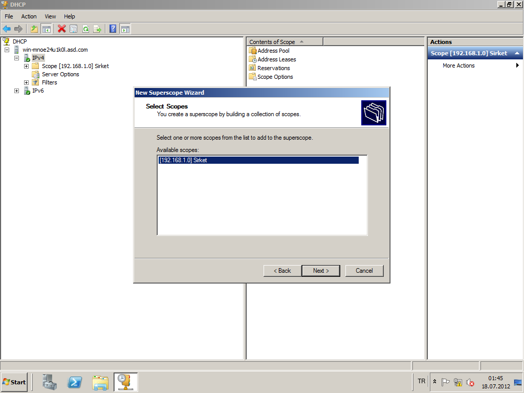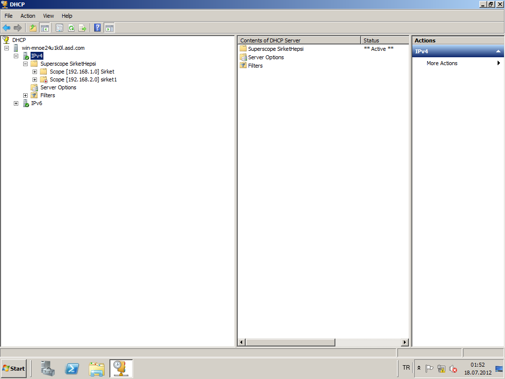 Görüldüğü gibi 192.168.2.0 network’üne ait ve isimi sirket1 olan bir scope daha superscope’umuza eklendi. Aktif olmayan scope’u aktif ettikten sonra kullanabiliriz.