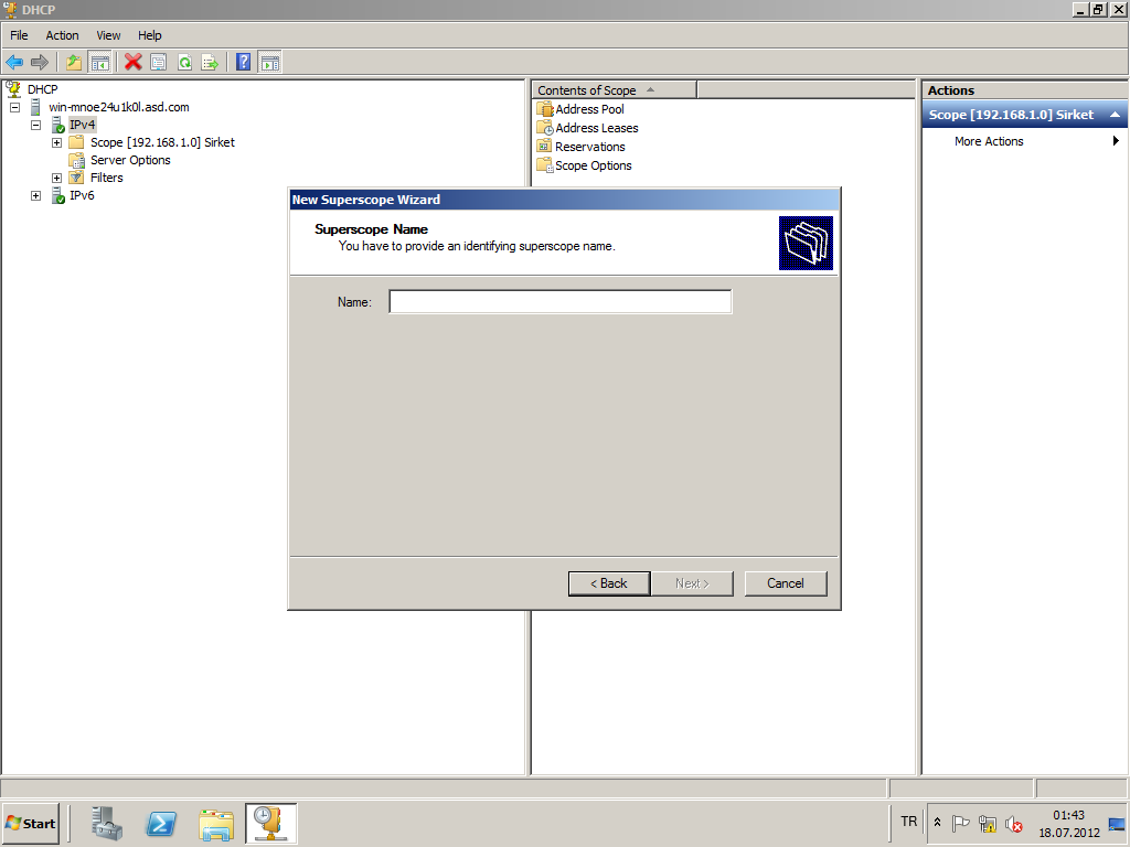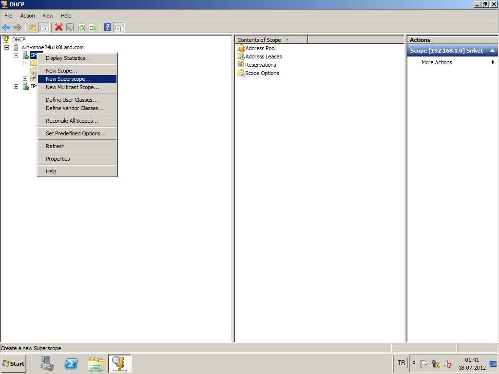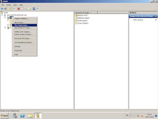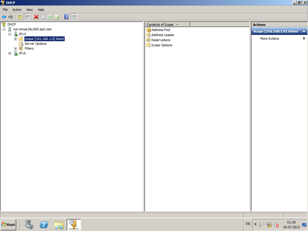 Görüldüğü gibi sirket adında 192.168.1.0/24 network id’sine sahip scope’um bulunmaktadır.