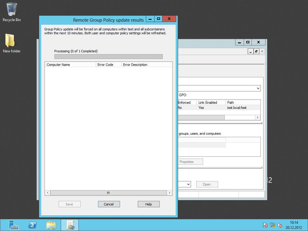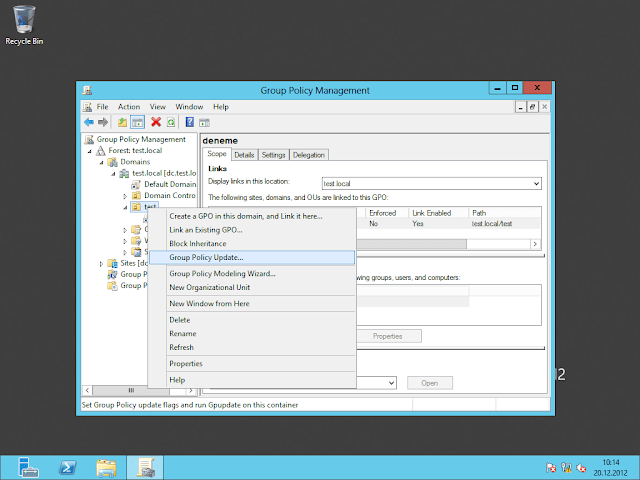Server 2012 ile gelen başka bir yenilik ise clientlara bağlanmadan GP update yapabilmemizdir.Server 2012 alt versiyonlarında group policy üzerinde yaptığımız herhangi bir değişiklikte client üzerinde gpupdate yada gpupdate /force yapıyorduk.Server 2012 ile birlikte GP management arayüzünden bu işlemi geçerli group policy’nin bağlı olduğu OU da GPUPDATE yapabiliyoruz.