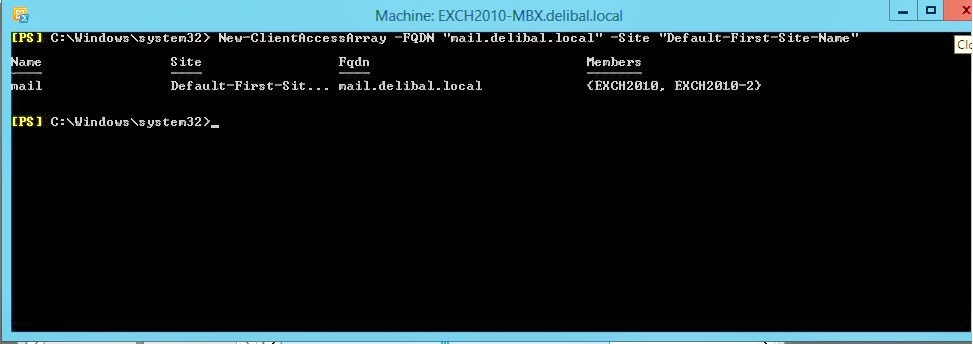 Sonraki işlemimiz Oluşturulucak CAS Array’in fqdn ve site bilgisini girmek resimde görüldüğü gibi komutu exchange powershell’de giriyoruz.