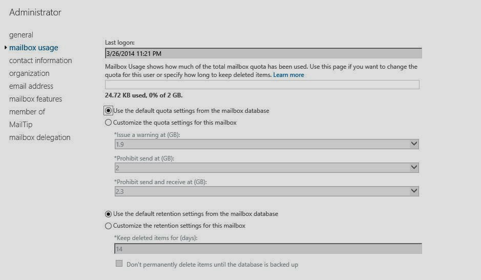 Tek bir kullanıcının mailbox’ının boyutu ve uyarı boyutlarını belirlemek için kullanıcıya çift tıkladıktan sonra mailbox usage kısmına geliyoruz. İlk seçenek olan ayarlamaları mailboxdatabase’den al yerine 2.seçeneği yani customize ‘ı tıklıyoruz ve alttaki kısımlara mailboxdatabasede girdiğimiz gibi değerleri giriyoruz.