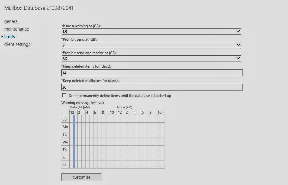 Bu kısımda ise bu database üzerinde bulunan mailbox’ların limitleri ve bu limit aşımlarında exchange server’in kullanıcıya bilgi vermesini sağlıyacağız.