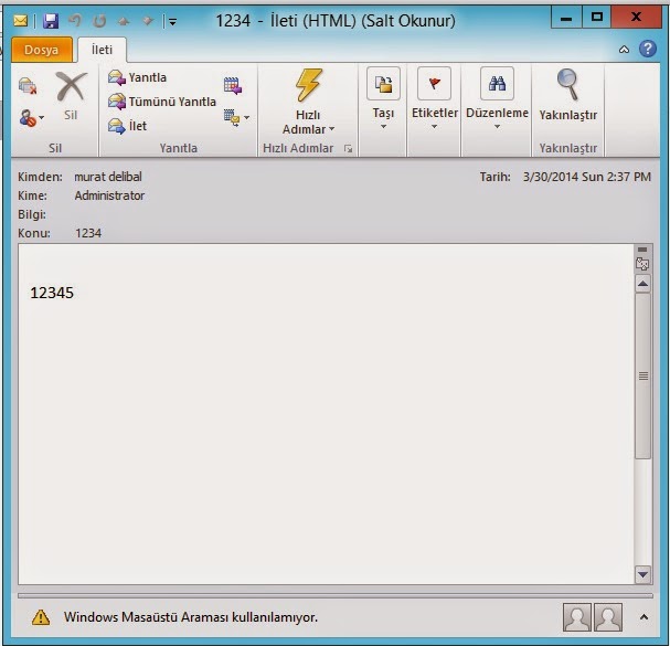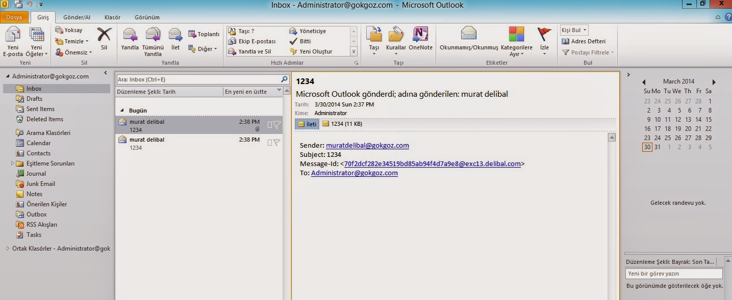 murat.delibal kullanıcısı administrator e 1234 konulu “12345” içerikli bir mail yolluyor. İlk gelen mail doğal murat kullanıcısının administrator’e attığı normal mail . Diğer gelen mail ise murat kullanıcısının administrator adlı hesaba mail attığını bildirmekte ve mailde ek olarak yollanan mailde bulunmaktadır.