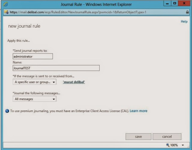 “Journal the following messages” kısmına mesaj türünü giriyoruz. Örneğin ; sadece gelen mailler yada sadece giden mailler gibi. Ben bütün mailler olarak belirledim.