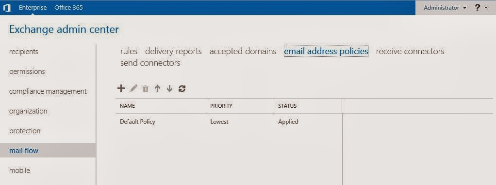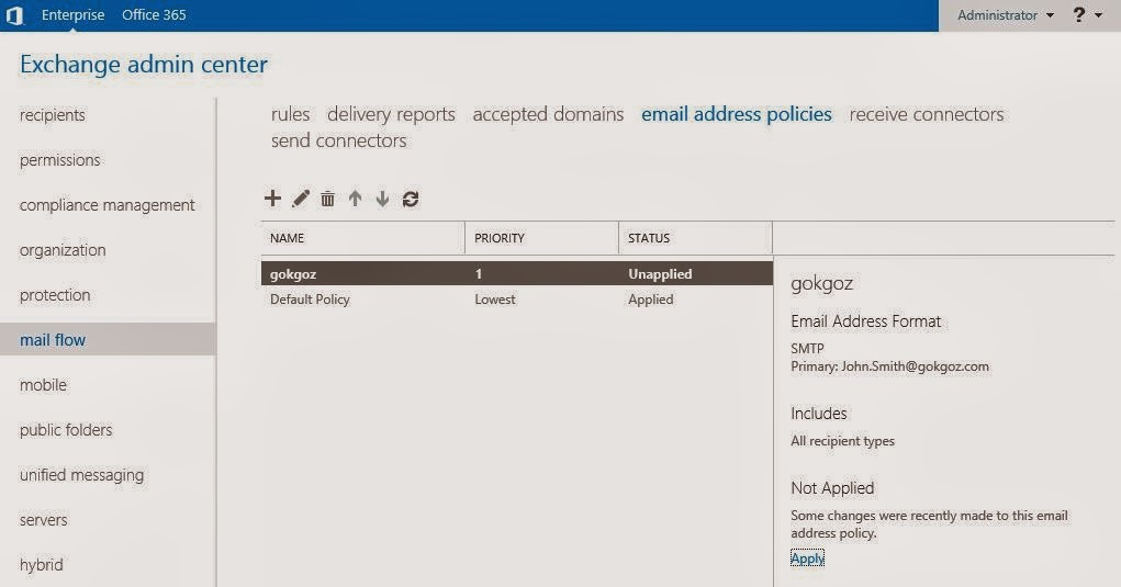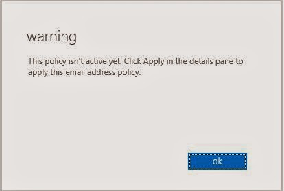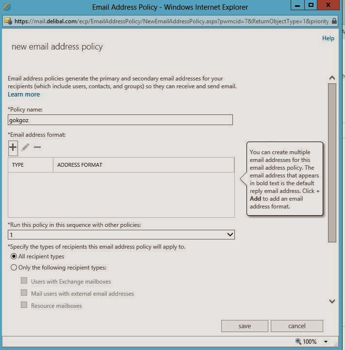 Oluşturduğumıuz Accepted domain’i bir email adress policies’e bağlamamız gerekir. İsterseniz bir email adress policies’de birden fazla accepted domain bulundurabilirsiniz. Ben yeni bir email adress policies nasıl yapılır göstermek için default policy’i kullanmayacağım. “+” butonuna tıklıyoruz.