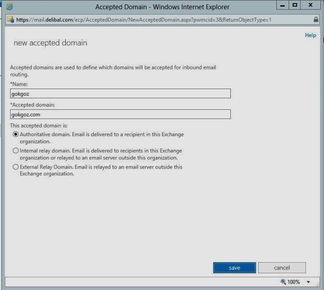 Accepted Domain kısımna adına gönderim ve alım yapıcağımız domain’i giriyoruz. Ben “gokgoz.com” şeklinde girdim