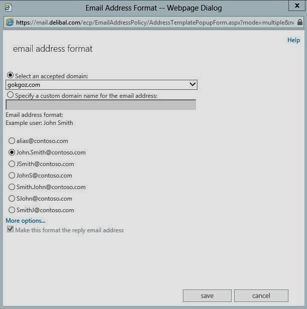 Alt kısımda seçilen accepted domainde Recipient’ların isim formatının nasıl olacağını belirtiyoruz. Ben isim.soyisim@gokgoz.com seklinde olmasını istediğim için 2.seçeneği seçtim. More options kısmı ile bu accepted domaini bir OU yada bağlayabilirsiniz ben bütün yapıda bu adress policies’in geçerli olmasını istediğim için save diyorum.