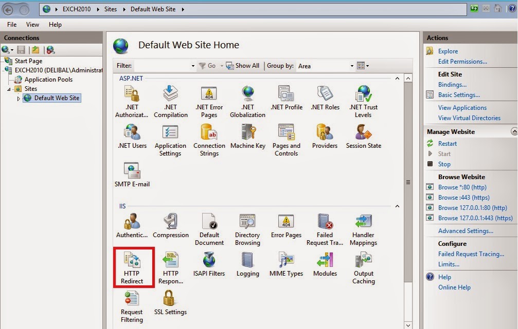 Sağ kısımda Default Web Site seçili iken HTTP Redirect’e çift tıklıyoruz.