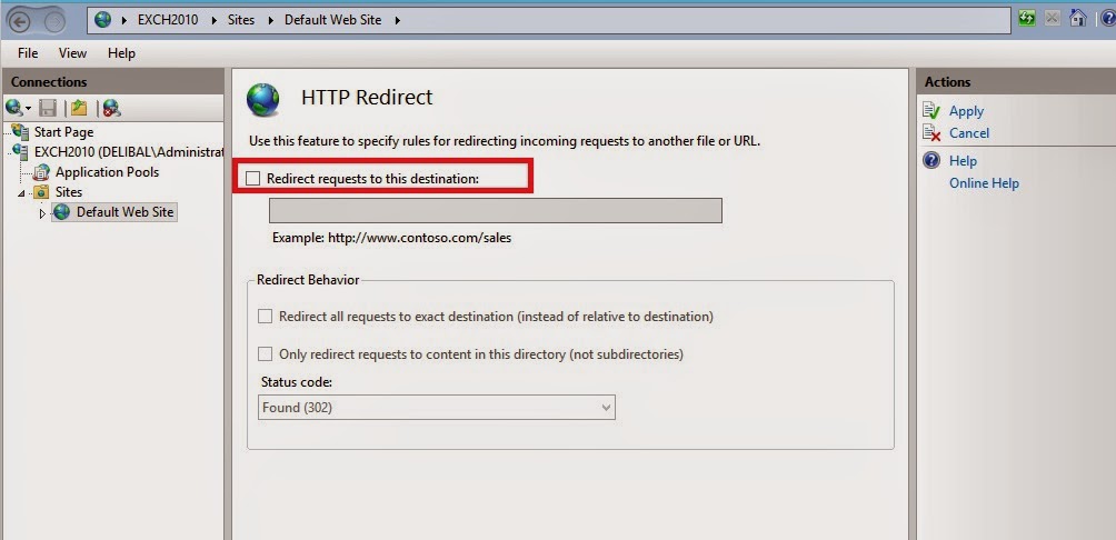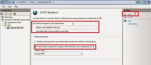 “Redirect request to this destination” bu tick işaretini tıkladığımız zaman Default Web Site’a yani https:\\”CAS Fqdn” ‘ e gelen bütün istekleri alttaki kısımda yazıcağımız url e yönlendiricektir. Tick işaretini tıklıyoruz.