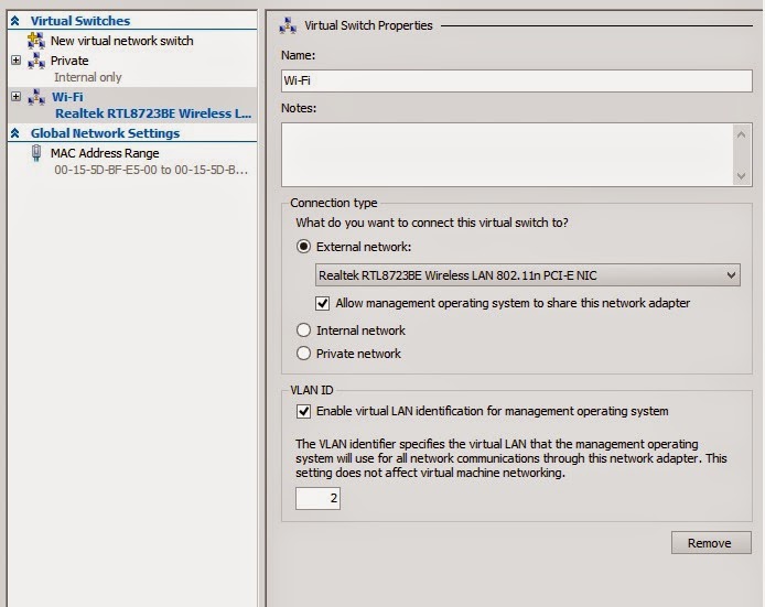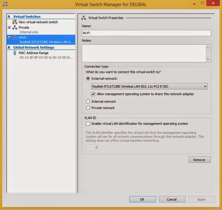 External bir network adaptörü oluşturucağınız zaman fiziksel sunucunuzun da bu network adaptörü üzerinden internet vb şeyler için erişim sağlamasını istiyorsanız bu seçenek seçili kalmalıdır. Bu seçenek seçili ise hangi isimle network adaptörü oluşturursanız aşşağıdaki gibi network connections kısmında o isimle bir virtual network adaptör görüceksinizdir.
