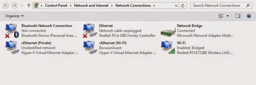 Görüldüğü gibi Wi-Fi adında bir external adaptör oluşturdum ve network connections kısmında bu adaptör oluşturuldu ve fiziksel sunucuma vEthernet (Wi-Fi) ile internet erişimi bridge edildi.
