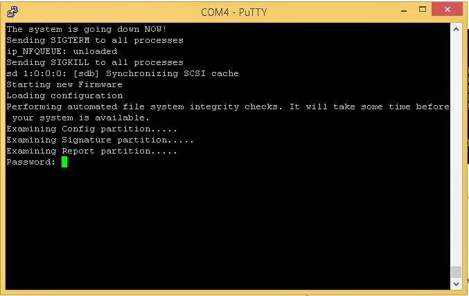 Ilk olarak bilgisayarımızı cyberoam cihazımıza seri porttan bağlıyoruz ve putty uygulaması ile cyberoam a bağlanıyoruz.