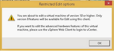 Aşşağıda Upgrade sonrası sanal makinamıza sağ tıklayıp edit settings dediğimizde hardware versiyon 8 feature’larını kullanabiliceğimiz. Harware versiyon 10 feature’larını kullanabilmek için VSphere Web client ı kullanmamız gerektiğini iletiyor.