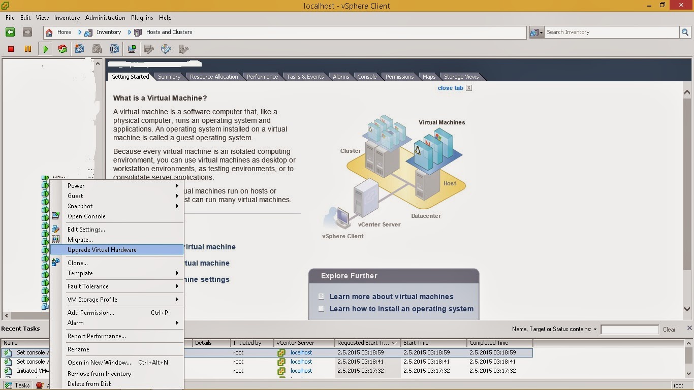 Bu yazımda esxi vcenter 5.5 versiyonuna sahip bir yappıda , harware versiyonu 8 olan sanal sunucunun hardware upgrade ini yapacağız.