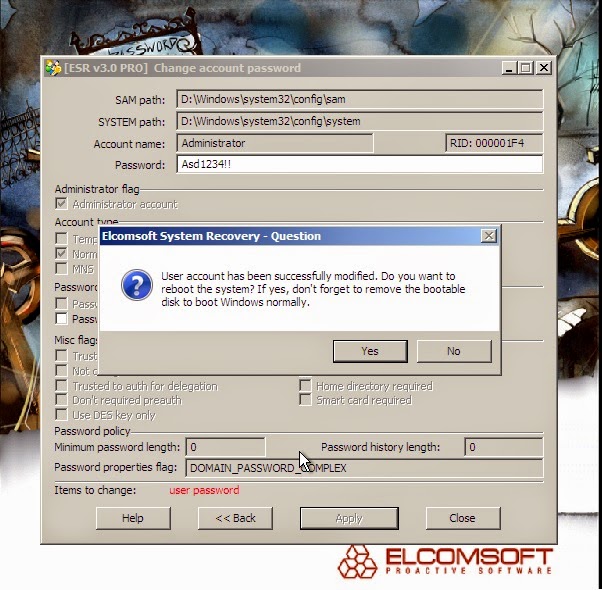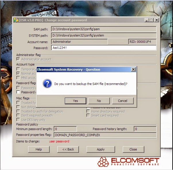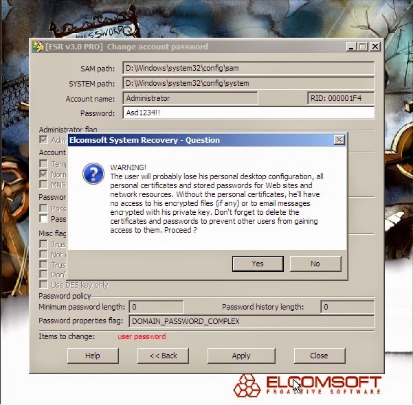 Local user şifre bilgilerinin bulunduğu SAM file üzerinde değişiklik olacağı için yedeğinin alınmasını istiyormusunuz diye uyarı geliyor . Yes diyoruz.