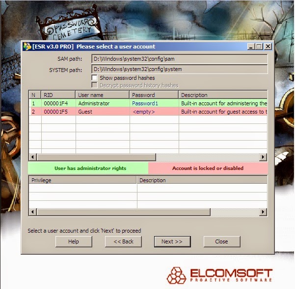 Userları taradıktan sonra karışımıza bu şekilde bir ekran gelmektedir. Burada bütün local userları görebilirsiniz. Yeşil ile işaretli olanlar Aktif . Pembe ile işaretli olanlar pasif durumdadır. Eğer administrator’unuz burda pembe ile işaretli ise bir sonraki ekranda “Account Disabled” tick işaretini kaldırmanız yeterli olacaktır. Bu alanda şifre çok karışık değilse şifreyi görebiliyoruz.