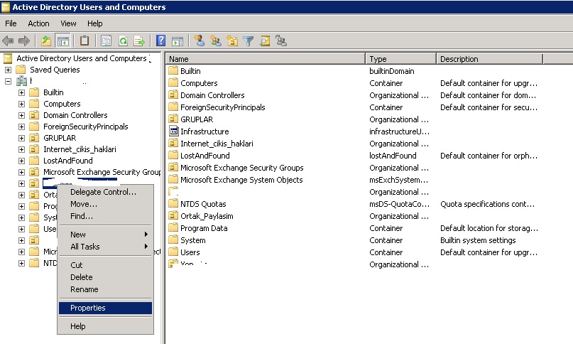 Sonrasında ilgili ou ya sağ tıklyaıp properties diyoruz.