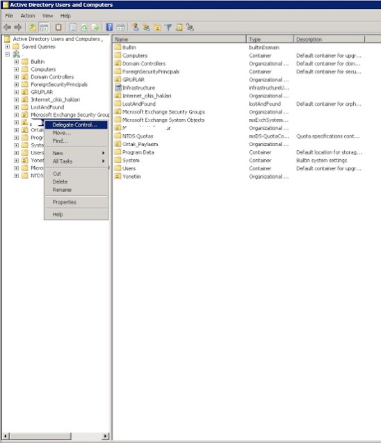 Bunun için Delegasyon vereceğimiz ou da sağ tıklıyoruz.