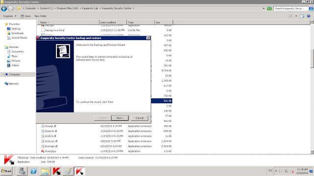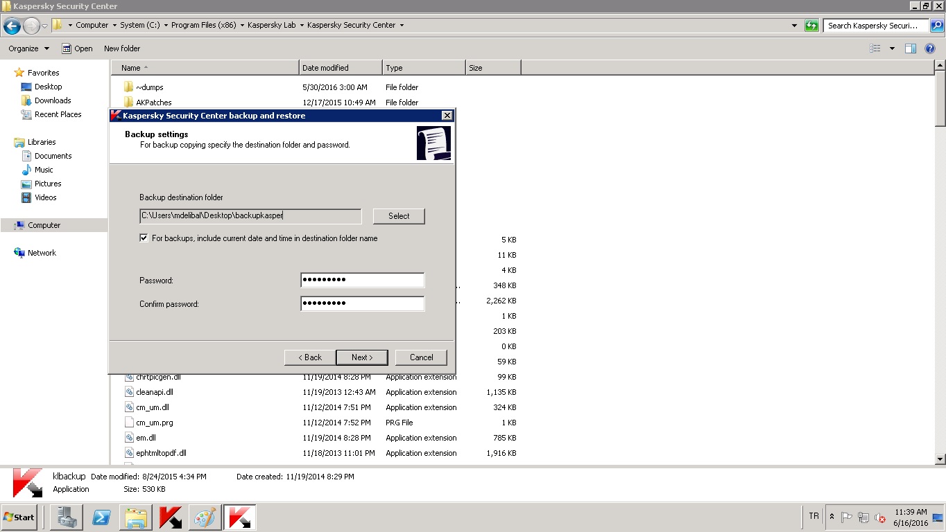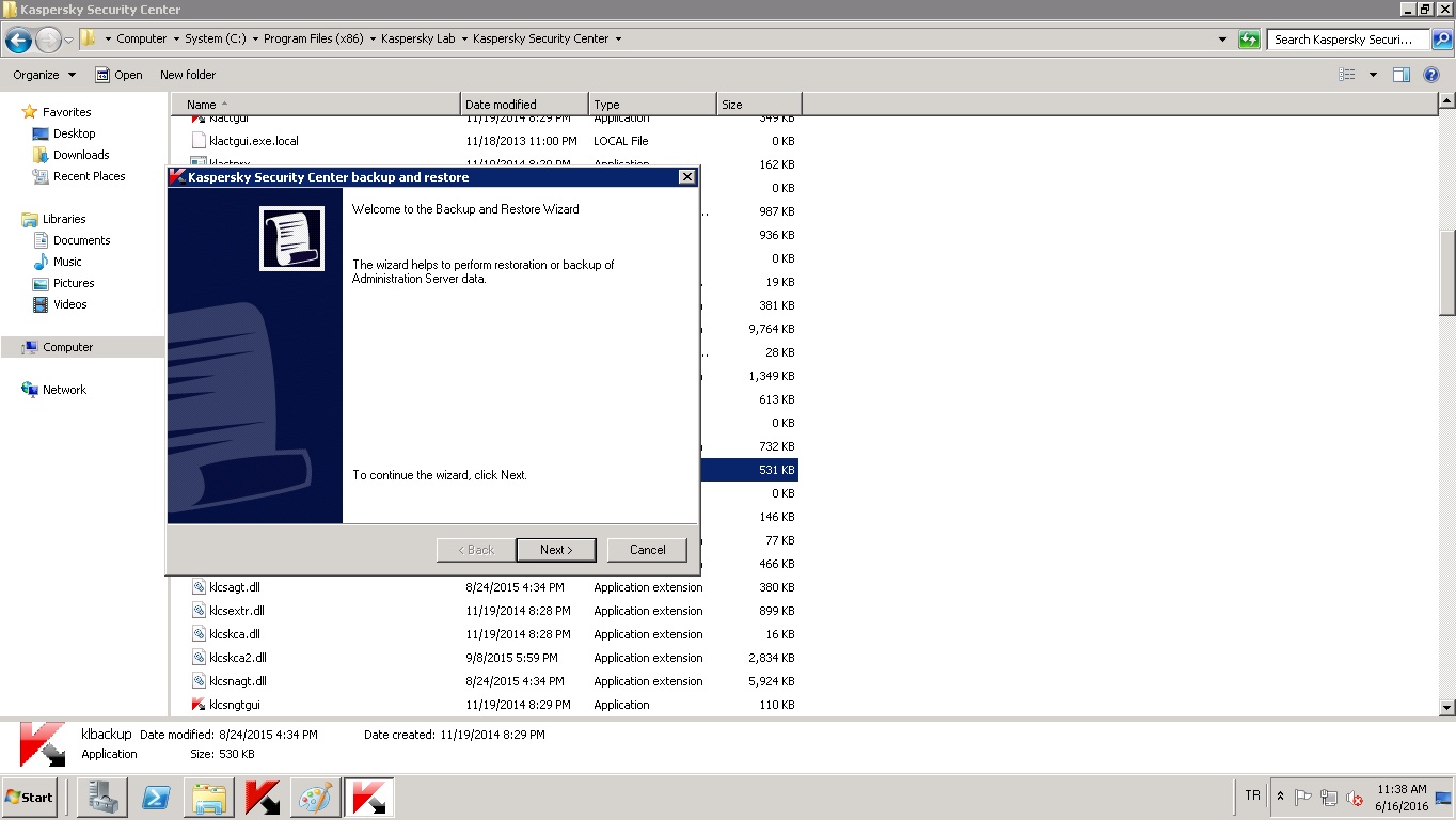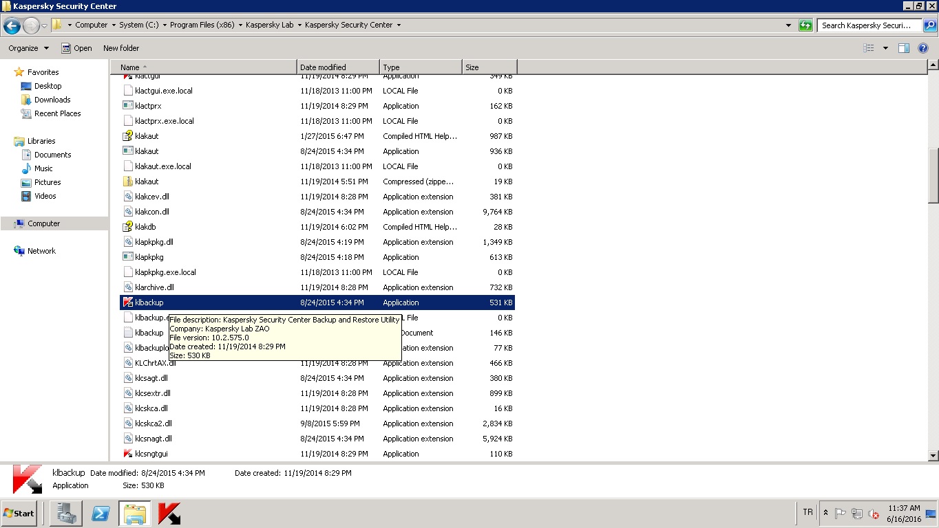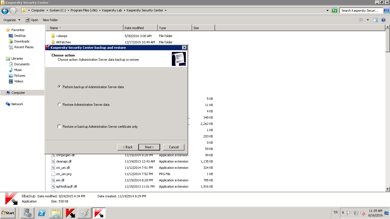 c:\Program Files(x86)\Kaspersky Lab\Kaspersky Security Center dizinine gidiyoruz ve klbackup.exe ye çift tıklıyoruz.