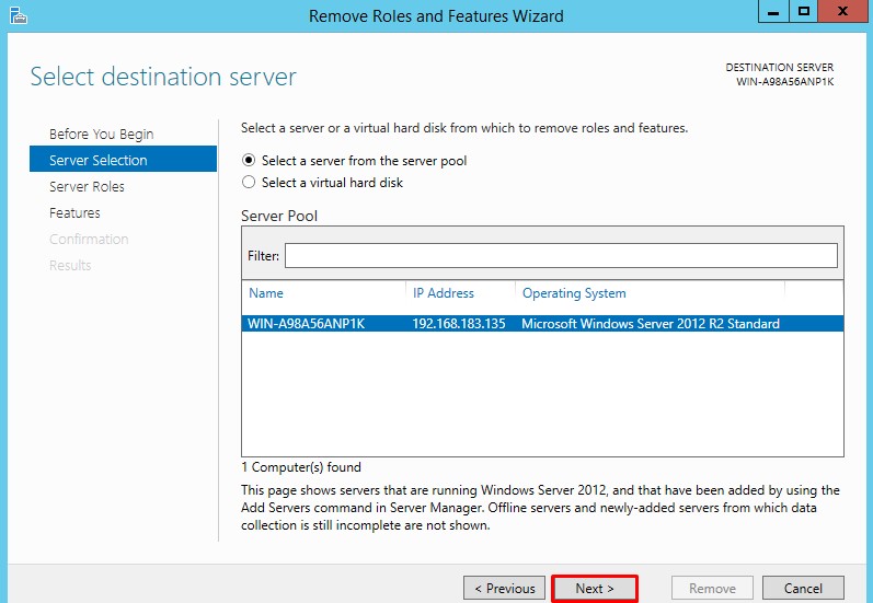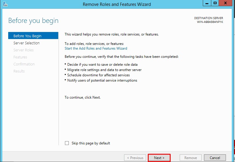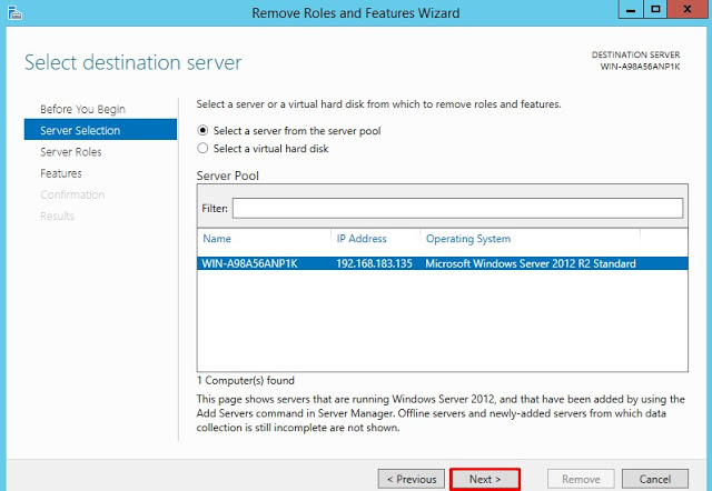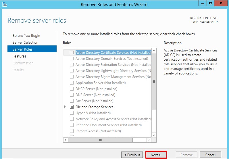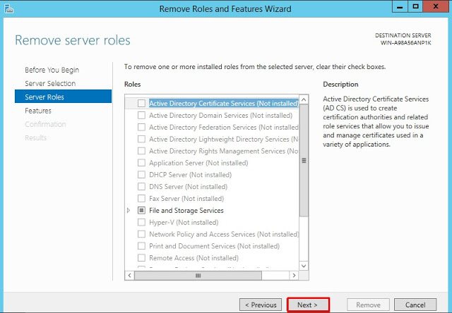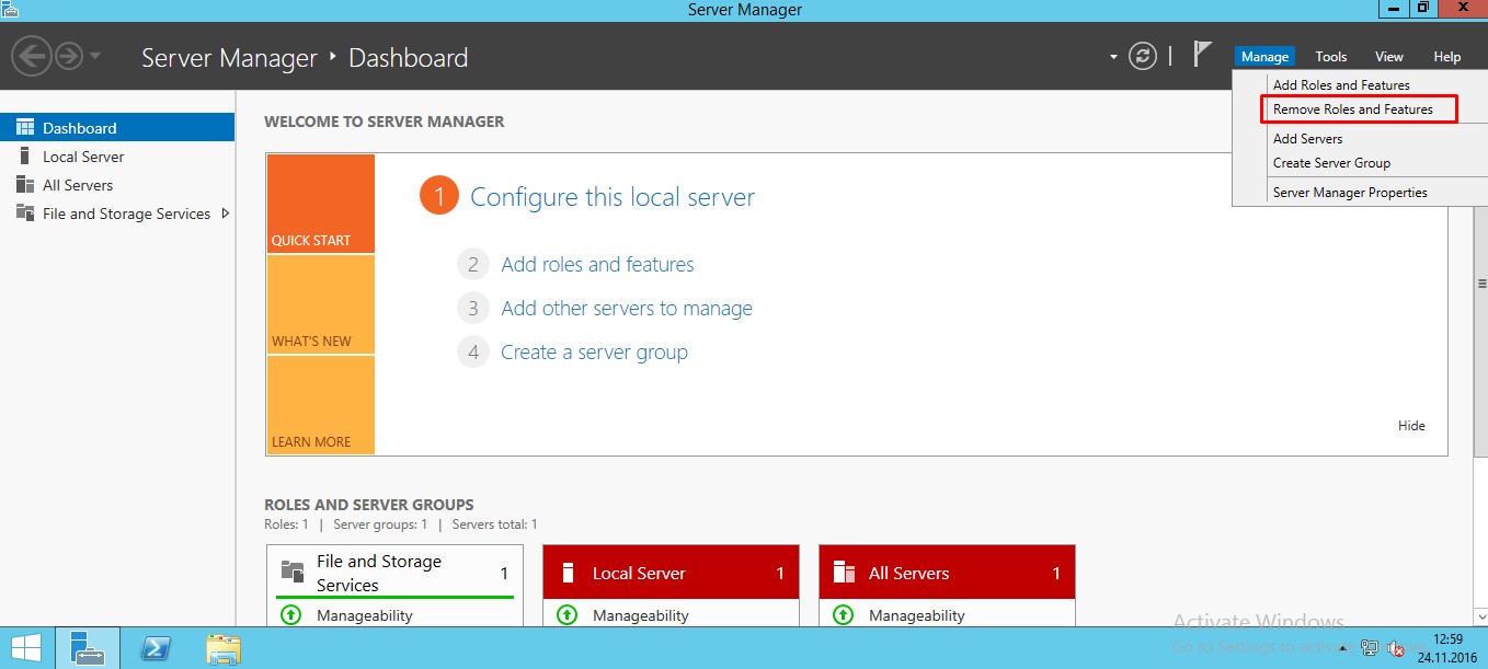 Server Manager üzerinde sağ üst kısımda bulunan Manage’e tıklayarak Remove Roles And Features diyoruz.