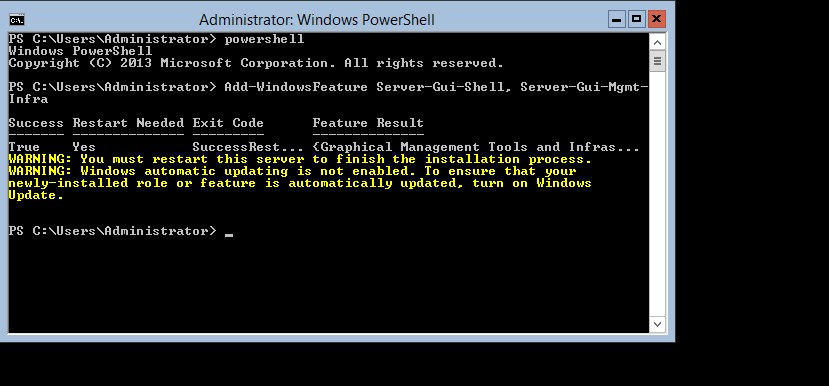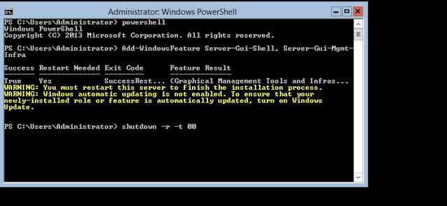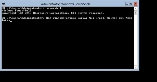 Sonrasında “Add-WindowsFeature Server-Gui-Shell, Server-Gui-Mgmt-Infra” komutunu giriyoruz.