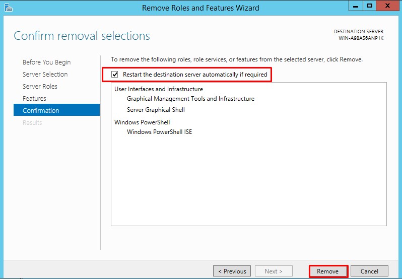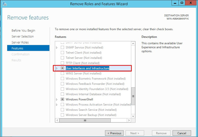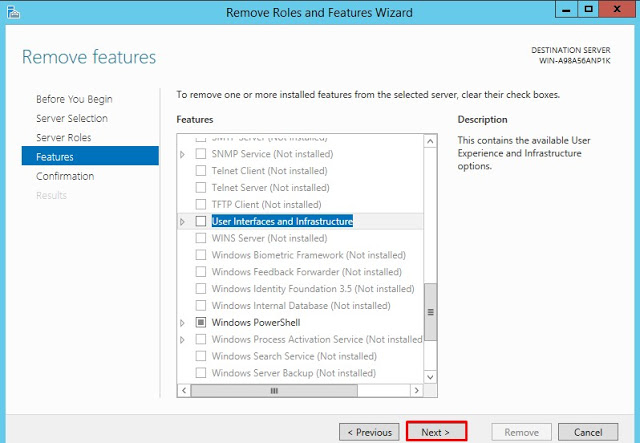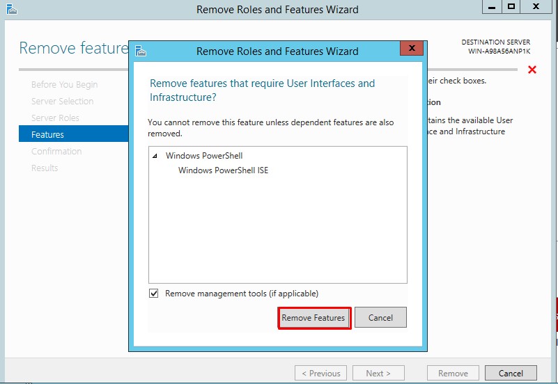 Belirttiğimiz Feature’ın yanında Powershell ISE ‘ında silineceğini bildiriyor. Remove Features diyerek devam ediyoruz.