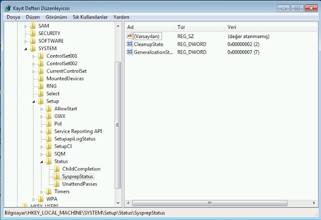 Sonrasında HKEY_LOCAL_MACHINE\System\Setup\Status\Sysprepstatus kısmına geliyoruz ve öncelikle Cleanupstate kısmını açıp 2 değerini giriyoruz. Sonrasında GeneralizationState kısmına ise 7 değerini giriyoruz.