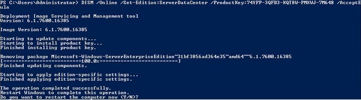 Komut girilip işlem tamamlandıktan sonra bilgisayara restart atıp atmamak istediğimizi sormakta. Restart sonrası Datacenter versiyonuna geçilecektir.