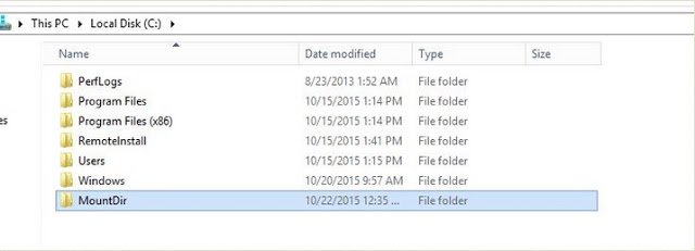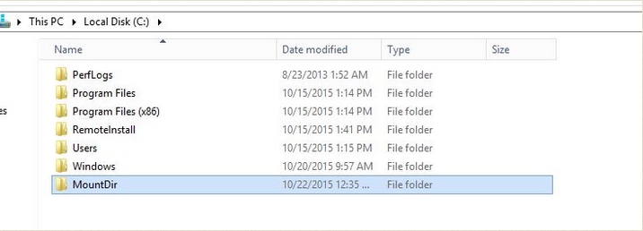 İlk olarak alttaki resimde görüldüğü üzere C:\ Dizini içerisine MountDir klasörü oluşturuyorum.