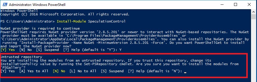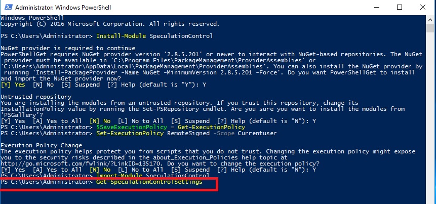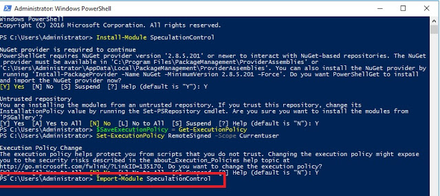 Yüklemesini tamamladığımız Module’ü Import ediyoruz.(Import-Module SpeculationControl)