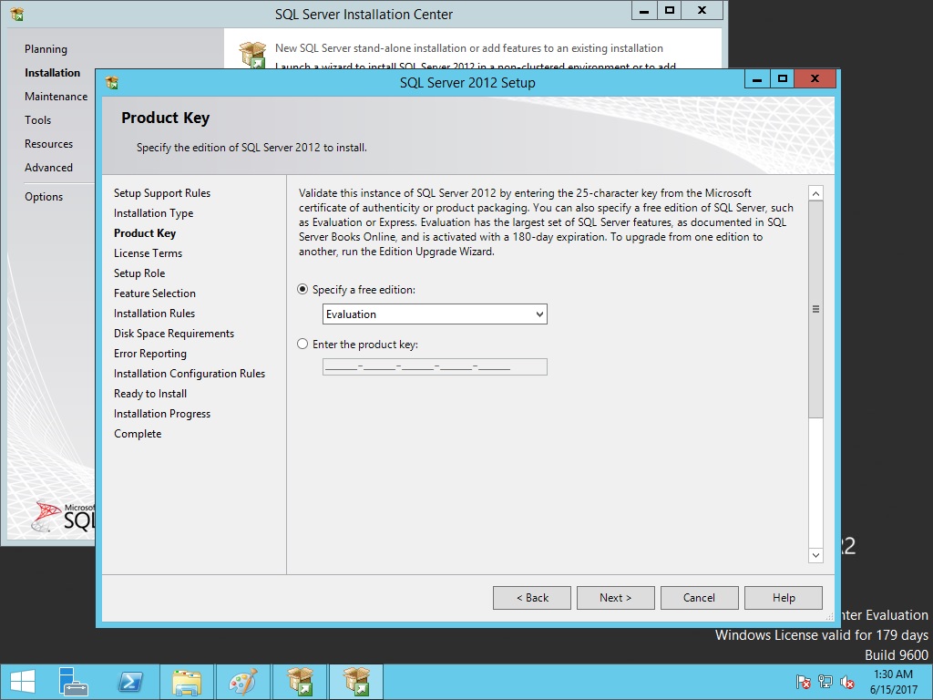 Bu kısımda eğer product key’iniz var ise alt kısmı seçip key girebilirsiniz. Yok ise evaluation diyerek devam edebilirsiniz.