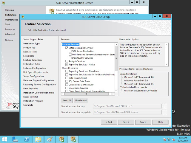 SCCM 2012 için Database Engine Services ve Reporting Services yeterlidir. Bu iki seçeneği seçip next diyoruz.